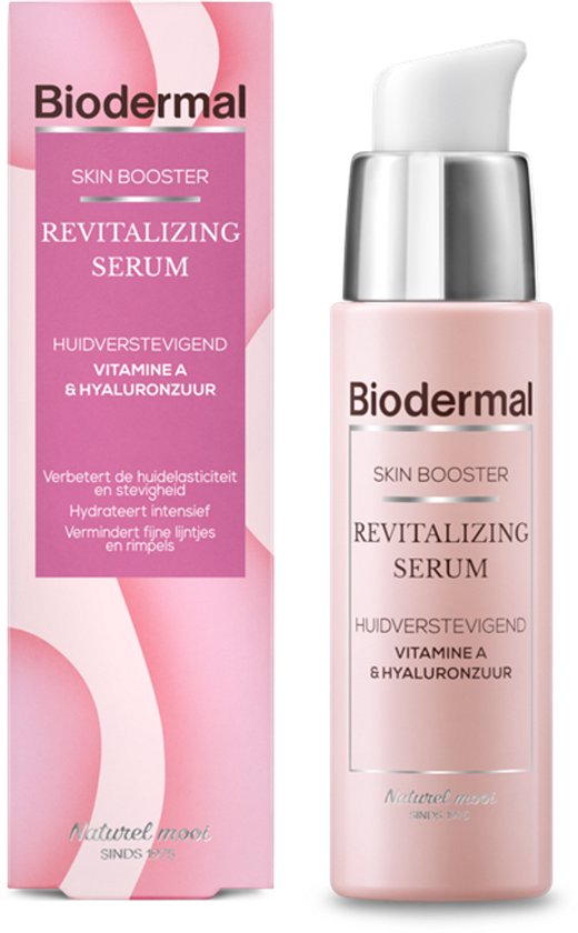 Nieuw van Biodermal Biodermal Skin Booster Revitalizing serum. Biodermal Revitalizing Serum is een krachtige en hoog geconcentreerde skin boosterformule. De combinatie van vitamine A en hyaluronzuur werkt huidverstevigend en gaat op effectieve wijze tekenen van huidveroudering tegen zoals het verlies van elasticiteit. Fijne lijntjes en rimpels worden zichtbaar vermindert en de huid intensief gehydrateerd. De parfumvrije, lichte textuur wordt gemakkelijk door de huid opgenomen en vormt een ideale basis voor de dag- of nachtverzorging. Geschikt voor alle huidtypen. Deze serum past bij alle gezichtsverzorging en zorgt ervoor dat ze net iets harder werken.