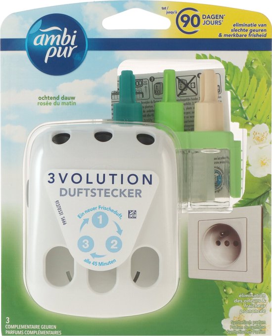The Morning Dew fragrance is inspired by the freshness of a cool morning walk, with morning dew refreshing the flowers and grass, while a revitalizing breeze gently wakes you up. The Ambi Pur 3Volution air fresheners are a breath of fresh air for your home, eliminating odors and freshening the air. We easily get used to scents, which means that we eventually stop noticing the smells around us. The Ambi Pur 3Volution air freshener solves this problem by automatically alternating between 3 complementary, high-quality scents every 45 minutes.