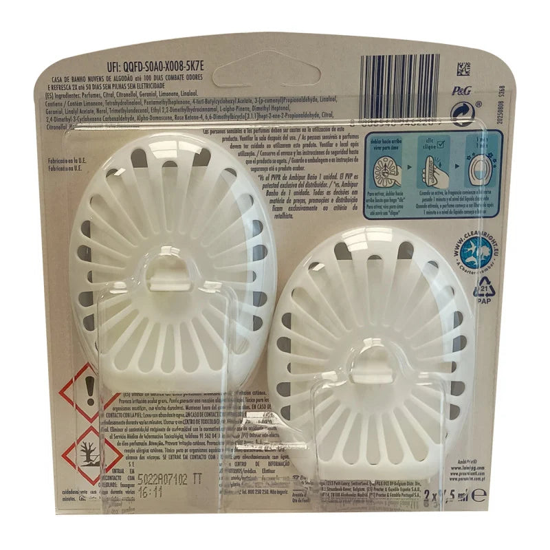Ambipur Baño Ambientador 2 × 7,5 ml – Nubes de Algodón es un ambientador especialmente diseñado para el baño, que ayuda a neutralizar los malos olores y deja un aroma fresco y agradable. Su fragancia Nubes de Algodón ofrece una sensación suave, limpia y reconfortante, inspirada en la frescura de la ropa recién lavada.