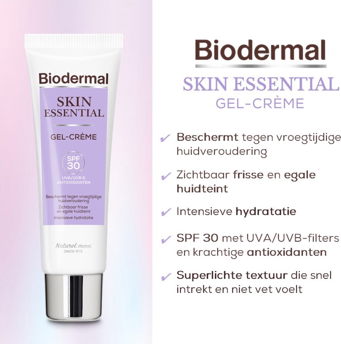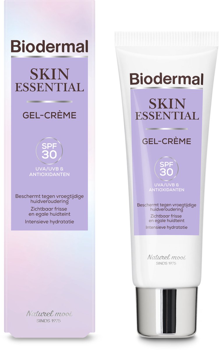 UV radiation and free radicals are major causes of premature skin aging. Biodermal Skin Essential Gel-Crème contains essential ingredients that the skin needs daily for protection, improvement and hydration. The light texture is quickly absorbed, does not feel greasy and does not clog pores. The gel-cream provides optimal protection with SPF 30 with UVA and UVB filters and powerful antioxidants. Niacinamide and sarcosine improve skin tone and texture and hyaluronic acid provides intensive hydration.