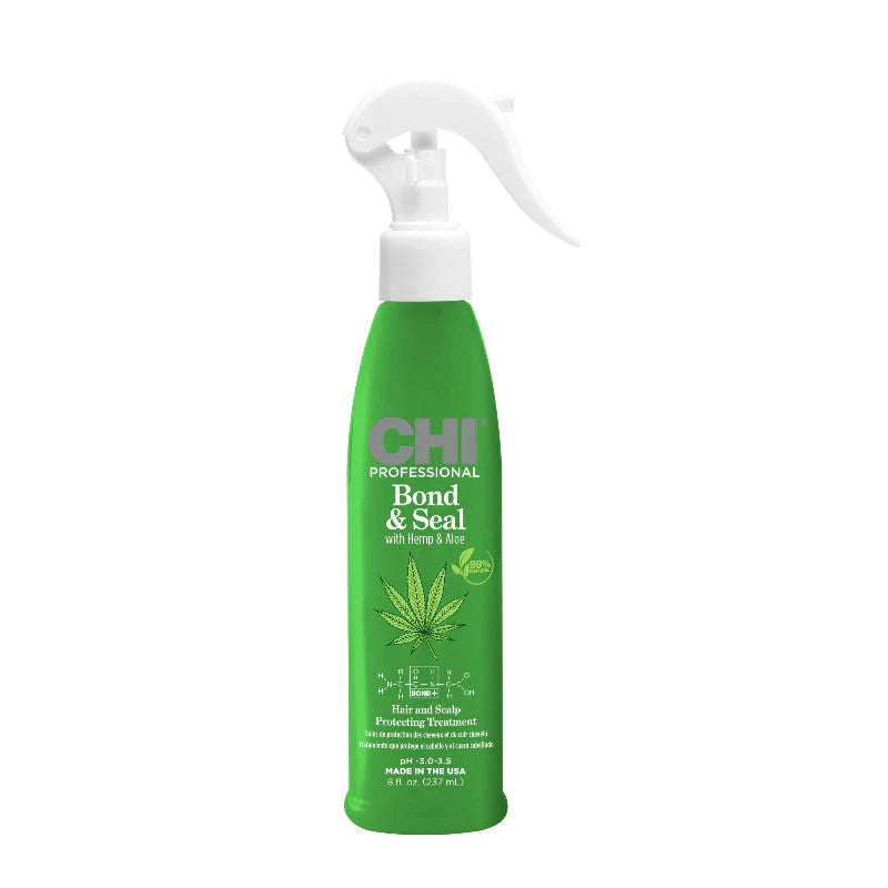 CHI Bond & Seal 237ml is een natuurlijke bondingspray die het haar en de hoofdhuid versterkt en beschermt tijdens kleur- of ontkleuringsbehandelingen. Het bevat hennepolie en aloe vera, die samen helpen bij het versterken van de haarschubben, het balanceren van de pH-waarde en het beschermen tegen chemische schade.