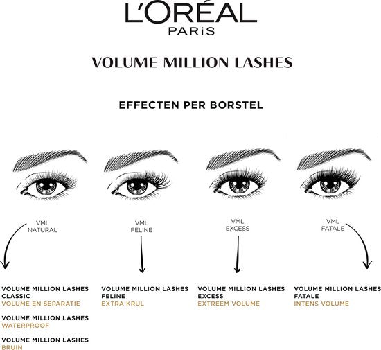 The Volume Million Lashes brush adds volume to every lash, even the shortest ones, thanks to the different sized hairs. The unique product design ensures that you get just the right amount of formula on the brush to prevent clumping. With the fatal mascara, the lashes are visibly extra multiplied for a full look, as if you have a million lashes.