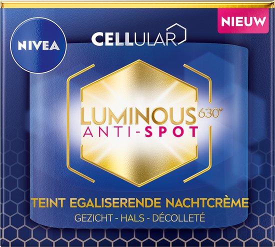 The secret of the NIVEA CELLular LUMINOUS630 Anti-pigment moisturizing cream is the addition of LUMINOUS630. This substance regulates the production of melanin and thus prevents the formation of new pigment spots. At the same time, existing pigment spots become visibly lighter and smaller. The cream not only works against pigment spots, you also enjoy a moisturizing effect. The anti-wrinkle cream is enriched with hyaluronic acid. This substance is particularly good at attracting moisture and keeps the skin supple and hydrated. This way, your skin is strengthened during the night, while the complexion evens out. Massage NIVEA CELLular LUMINOUS630 Anti-spot Teint Equaliseren Nachtcrème into your face, neck and décolleté in the evening for the best results and combine it with the NIVEA Anti-spot Luminous Serum.