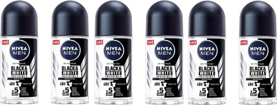 This set contains 6 pieces of the Nivea Men Black & White Invisible Original Roll-On Deo of 50 ml. The special formula prevents white streaks on dark clothing and yellow stains on light fabrics. Provides up to 48 hours of effective protection against sweat and body odor. With a pleasant masculine scent, perfect for everyday use.