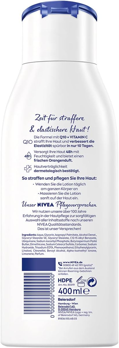 - Practical delivery – Nivea Q10 skin firming body lotion + vitamin C, 1 x 400 ml bottle, item number 81836