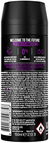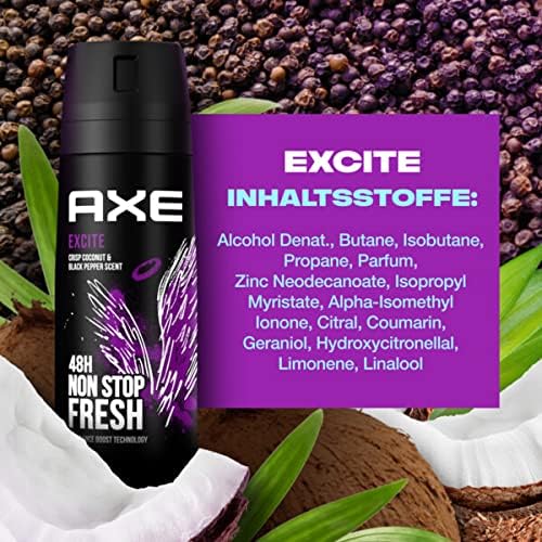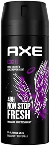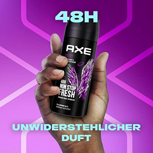 Nous vivons probablement l'époque la plus exaltante de tous les temps. Tout semble possible aujourd'hui. Alors que nous vivons et faisons des choses dont personne n'oserait rêver il y a peu, la prochaine aventure nous attend à la seconde suivante, dans la rue suivante ou derrière un sourire. Ce déodorant en spray, au parfum envoûtant, a été créé pour cette époque exaltante. Il associe la protection efficace AXE contre les odeurs corporelles à l'un des parfums les plus captivants, développé par les meilleurs experts en parfumerie au monde. Grâce à sa nouvelle technologie Double Action, ce déodorant combat les bactéries responsables des odeurs et neutralise les mauvaises odeurs. Une technologie innovante au zinc crée une expérience parfumée unique. Totalement exempt de sels d'aluminium, ce déodorant protège si efficacement son porteur qu'il peut compter sur sa présence confiante et rassurante, même dans les situations les plus tendues. Ce parfum est construit comme une histoire captivante aux multiples personnages. Le protagoniste est un fond boisé à la présence masculine puissante. Mais les véritables protagonistes de l'histoire sont la noix de coco, la noisette et le caramel. Les personnages extraordinaires s'accordent parfaitement et donnent à l'histoire une tournure surprenante grâce à leur touche douce et subtile. Ensemble, ils créent une composition captivante qui stimule les sens tout en protégeant efficacement des mauvaises odeurs, sans aluminium. Vaporisez simplement sur les aisselles et le haut du corps et profitez jusqu'à 48 heures de fraîcheur longue durée grâce à la technologie Fragrance Boost. AXE s'engage pour le développement durable : notre ambition est que tous les emballages AXE soient recyclables, voire contiennent des matériaux recyclés, d'ici 2025. L'aluminium du déodorant est recyclable à l'infini. Veuillez recycler la boîte vide.