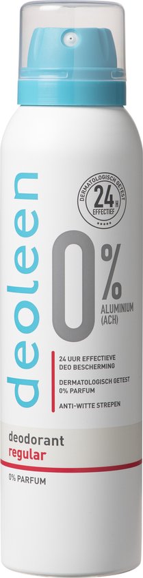 Le déodorant Deoleen 0 % aluminium en spray régulier ne contient ni aluminium (ACH), ni parfum, et ne laisse pas de traces blanches sur vos vêtements. Deoleen 0 % offre 24 heures de protection déodorante efficace et douce, pour une sensation de propreté et de fraîcheur.
