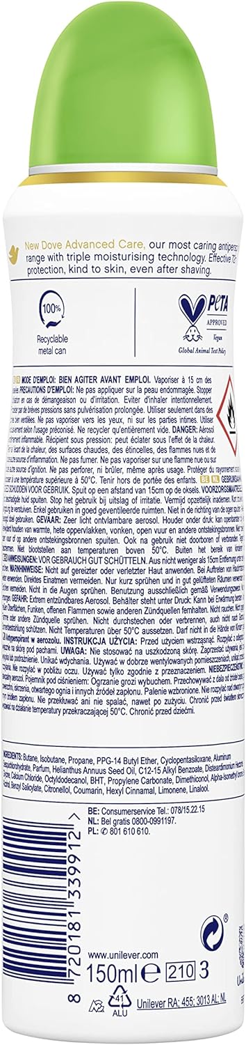 Pourquoi choisir l'antitranspirant Dove Advanced Care ? Le déodorant en spray Dove Advanced Care Go Fresh Concombre et Thé Vert s'inspire de la nature. Le concombre rafraîchit, tandis que le parfum du thé vert procure une sensation de calme et de détente. De plus, ce déodorant offre la protection fiable que vous attendez de Dove : 72 heures de protection contre la transpiration. Les antitranspirants Dove Advanced Care font partie de la gamme la plus douce de Dove ; grâce à leur formule brevetée améliorée, ils sont doux pour la peau. La gamme Dove Advanced Care offre jusqu'à 72 heures de protection contre la transpiration grâce à la technologie Triple Hydratation. Une sensation de fraîcheur et de bien-être tout au long de la journée, quelle que soit la journée ! Ce déodorant en spray aux propriétés bienfaisantes du concombre aide votre peau sensible à se remettre des irritations dues au rasage. Mode d'emploi : Agitez le flacon, tenez-le à environ 15 cm de votre aisselle et vaporisez brièvement et fermement. Dove propose des antitranspirants et des déodorants. Tous deux procurent une sensation de fraîcheur longue durée et nourrissent la peau délicate des aisselles. Les antitranspirants contiennent des sels d'aluminium qui réduisent la transpiration et gardent les aisselles sèches, prévenant ainsi les mauvaises odeurs. Les déodorants, quant à eux, n'en contiennent pas, mais contiennent des ingrédients actifs qui combattent les odeurs indésirables. Les deux formules sont sans alcool et enrichies de la technologie Triple Hydratation. Quel que soit votre choix, vous pouvez compter sur une protection, une fraîcheur et des aisselles merveilleusement douces, lisses et soignées. L'histoire de Dove : Dove aide les femmes du monde entier à réaliser leur plein potentiel et leur beauté individuelle en développant des produits de soin qui répondent aux besoins spécifiques de leur peau et de leurs cheveux. Parce que nous sommes convaincus que celles qui se sentent belles et bien dans leur peau, avec des soins adaptés, peuvent rayonner de beauté. Afin de réduire leur impact environnemental, les antitranspirants et déodorants Dove ont été repensés. L'aérosol en aluminium de cet antitranspirant est 100 % recyclable à l'infini. Les déodorants antitranspirants Dove sont végans et portent le label PETA.