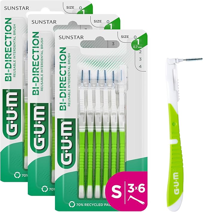 Brossettes interdentaires GUM BI-DIRECTION taille ISO 1 (0,7 mm), conçues avec un manche plus long pour un nettoyage facile et complet entre les dents. Le paquet contient 3 jeux de 6 brossettes chacun (18 brossettes au total).
