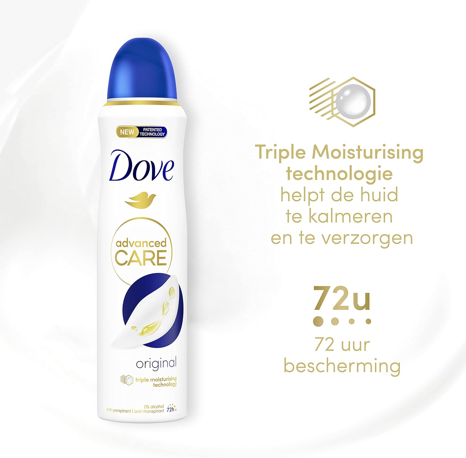 Waarom Dove Advanced Care Anti-Tanspirant? De Dove Advanced Care Original Anti-Transpirant Deodorant Spray is de klassieke deodorant van Dove en is al sinds de begindagen van Dove topfavoriet voor gevoelige oksels. De Dove Advanced Care anti-transpiranten maken deel uit van de meest verzorgende lijn van Dove, met de verbeterde gepatenteerde formule zijn ze zacht voor de huid, zelfs na het scheren. Het Advanced Care assortiment van Dove biedt met de Triple Moisturising technologie 72 uur bescherming tegen zweet. De hele dag een fris en verzorgd gevoel – wat de dag je ook brengt! Hoe te gebruiken? Voor het beste resultaat gebruik je onze Dove Original spray na het douchen als je huid droog en koel is. Schud de deodorantbus goed heen en weer, hou de spuitbus op 15 centimeter van je oksel en spray de deodorant ongeveer 2 seconden onder je oksel. Dove biedt naast anti-transpiranten ook deodoranten aan. Beide geven een langdurig fris gevoel en hebben een verzorgende werking voor de kwetsbare okselhuid. Anti-transpiranten bevatten aluminiumzouten die de hoeveelheid zweet verminderen en ervoor zorgen dat je oksels droog blijven, zodat onaangename geurtjes geen kans krijgen. Deodoranten bevatten geen aluminiumzouten, maar wel actieve ingrediënten die ongewenste geurtjes bestrijden. Beide formules zijn vrij van alcohol en verrijkt met de Triple Moisturising technologie. Dus welke je ook kiest, je kunt altijd vertrouwen op bescherming, frisheid en heerlijk zachte, gladde en verzorgde oksels. Het verhaal van Dove Dove ondersteunt vrouwen wereldwijd bij het realiseren van hun volledige potentiële en individuele schoonheid door verzorgingsproducten te ontwikkelen die inspelen op de persoonlijke behoeften van hun huid en haar. Want wij geloven dat wie zich mooi en lekker in zijn vel voelt met de hulp van de juiste verzorging, dat ook kan uitstralen. Om de impact op het mileu te verminderen hebben de Dove anti-transpiranten en deodoranten een andere verpakking gekregen. De aluminium spuitbus van deze anti-transpirant is 100% en oneindig recyclebaar. Deze compressed anti-transpirant is met zijn kleinere verpakking ook beter voor het milieu. De Dove anti-transpirant deodorants zijn vegan en dragen het PETA-approved keurmerk.