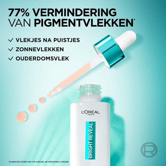 L’Oréal Paris Bright Reveal Dark Spot serum is jouw geheim voor het verminderen van pigmentvlekken en een doffe huid. Al vanaf het eerste gebruik van dit geavanceerde serum merk je direct de klinisch bewezen doeltreffendheid tegen diverse soorten vlekken, zoals zonne- en pigmentvlekjes, ouderdomsvlekjes en zelfs vlekken die zijn ontstaan na puistjes of onzuiverheden. Voor zichtbare resultaten in slechts één week. De formule is verrijkt met hoogwaardige dermatologische ingrediënten en biedt een krachtige combinatie van niacinamide en 2,5% aminosulfonzuur. Laat jouw huid stralen met dit vernieuwende, krachtige serum!