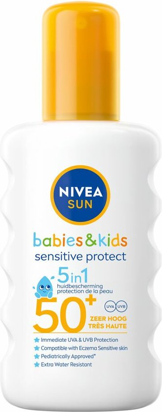 Nivea Sun Babies & Kids Sensitive Protect Spray SPF50+ biedt 5in1 huidbescherming tegen verbranding, langdurige huidbeschadiging en vermindert het risico op zonneallergieën. De formule biedt onmiddellijke UVA/UVB-bescherming en is ontwikkeld voor de gevoelige huid van baby's en kinderen vanaf 6 maanden. Nivea Sun Babies & Kids Sensitive Protect Spray SPF50+ is parfumvrij, extra waterbestendig en respecteert de oceaan door vrij te zijn van UV-filters Octinoxate, Oxybenzone en Octocrylene. Huidvriendelijkheid goedgekeurd door kinderartsen.*volgens OESO of gelijkwaardige methoden