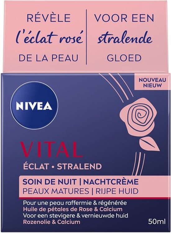 NIVEA Vital Stralende Nachtcrème 50ml. Voor een stralende gloed. Deze formule met Rozenolie & Calcium voedt de huid intensief tijdens de nacht en geeft een comfortabel gevoel bij het ontwaken. De formule bevat creatine om de natuurlijke aanmaak van collageen in huidcellen te stimuleren*. De huid wordt vernieuwd en verstevigd. Resulteerd in een gevitaliseerde en stralende huid. En verminderd zichtbaar rimpels. verminderd De intense hydratatie geeft de huid een comfortabel gevoel. * in vitro getest.