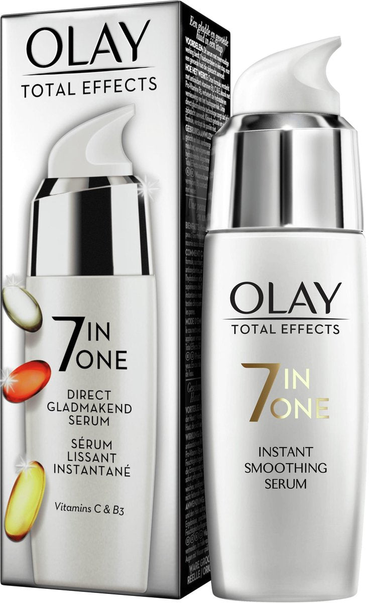 Een gladde en gevoede huid in één stap! Dit serum met meervoudige werking biedt 7 huidvoordelen in één stap, voor een gevoede huid die zijdezacht aanvoelt. De formule van Olay Total Effects vol met vitaminen B3, C, E en Pro-Vitamine B5, die antioxidanten bevatten en de hydratatie en vernieuwing van het huidoppervlak verbeteren. Deze direct gladmakende technologie zorgt ervoor dat je huid zijdezacht aanvoelt. Biedt 7 voordelen in één stap: hydrateert, zorgt voor een mooie gloed, egaliseert de huidteint, minimaliseert de poriën, maakt glad en vult op, vermindert fijne lijntjes en rimpels en beschermt tegen schadelijke invloeden van buitenaf De klinisch geteste en niet-vette formule verstopt de poriën niet.
