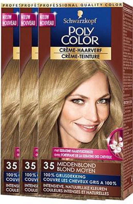 Poly Color Haarverf Creme - 35 Middenblond, De haarverf van Poly Color zorgt voor een prachtige dekkende kleur. Krijg een geweldige look met diepe natuurlijke of juist intense effecten. Voor een langdurig kleureffect en 100% grijsdekking, week na week! , Inhoud: Poly Color Haarverf Creme - 35 Middenblond