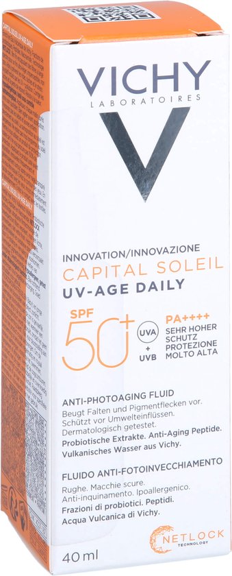 De Capital Soleil SPF50+ UV-Age Zonnefluide van Vichy brengt een dagelijkse UV-bescherming en een anti-age effect samen. Het beschermt het gezicht optimaal tegen UVA- en UVB-stralen terwijl het de zichtbare tekenen van huidveroudering door de zon (zoals pigmentvlekken en rimpels) neutraliseert. De formule is samengesteld met de gepatenteerde Netlock™-technologie die gebaseerd is op het emulsieprincipe: een gelbasis bevat microfijne druppels met UV filters. Eenmal aangebracht op de huid vormt de geltextuur een fijne, uniforme en ultra-bestendige beschermingslaag die bescherming biedt tegen UV stralen. Het is belangrijk om cellulaire fotoveroudering tegen te gaan om een stevige, volle en stralende huid te behouden. Dit houdt namelijk het dagelijks aanbrengen van een gezichtszonnebrand in, het hele jaar door. De formule van deze zonbescherming is verrijkt met 4% peptiden om rimpels te verminderen en 2% niacinamide om pigmentvlekken te verzachten. De formule is ontworpen voor alle huidtypes, pikt de ogen niet (samengesteld om jeukende ogen te vermijden), en is water-, zweet- en zandbestendig. De ultra lichte vloeibare textuur werkt als een beschermende film die zeer bestand is tegen UV en die transparant is op de huid, met een blote huid-gevoel. Capital Soleil UV-Age Daily SPF50+ bevat geen siliconen. Het is hypoallergeen, non-comedogeen, en verstopt de poriën niet. Oogheelkundig en dermatologisch getest.