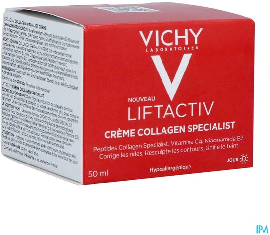 Vichy LiftActiv Collagen Specialist dagcrème gaat de zichtbare effecten van collageenverlies tegen, vermindert rimpels en pigmentvlekken en herdefinieert contouren. De nieuwe hypoallergene formule is nu geconcentreerd met vitamine Cg ter bescherming tegen vrije radicalen en bevat 3 keer meer collageenpeptiden voor een hoge doeltreffendheid tegen huidveroudering. Deze crème wordt aanbevolen voor vrouwen die op zoek zijn naar hoge anti-aging effectiviteit, een jonger uitziende huid en dermatologisch actieve ingrediënten. De dagcrème heeft een romige textuur die verandert in een poederachtige finish. De huid voelt direct gladder en steviger, comfortabel en gehydrateerd aan. Trekt snel in, plakt niet en is niet vet.
